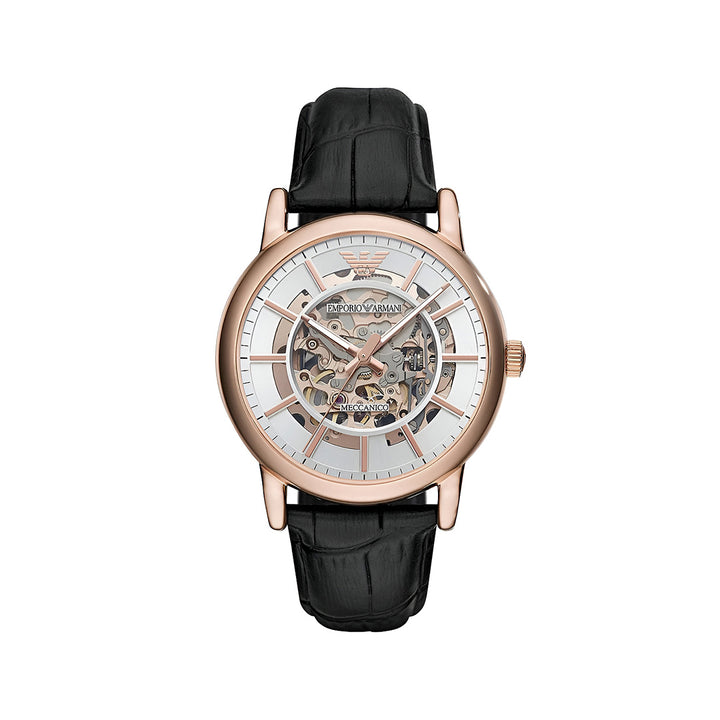 The Emporio Armani AR60007 watch is a men's timepiece, ideal for both elegant attire and casual wear. It features a black leather strap and a rose gold-colored steel envelope. The original bright dial is covered with mineral glass, which satisfactorily protects it from scratches and dings. A window has been placed on the dial for viewing the inside of the watch, which gives the whole thing a very stylish look.