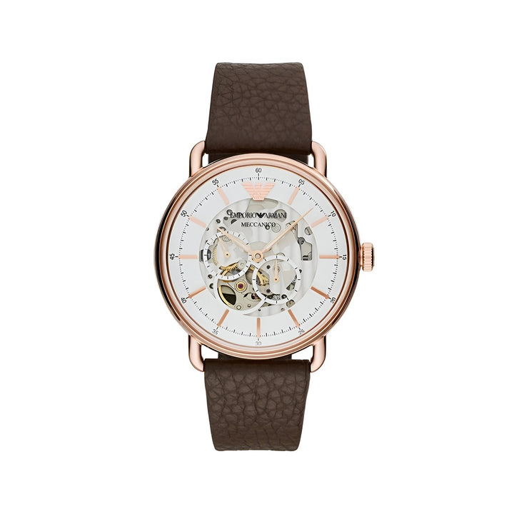 Emporio Armani Men's Automatic Brown Leather Timepiece - This 43mm watch features a white skeleton dial with rose gold-tone stick indexes, automatic movement, and a brown genuine leather strap. Composition 70% Stainless Steel, 15% Leather, 12% Crystal, 3% Plastic. This stylish and handsome timepiece is sure to complete any man's collection.