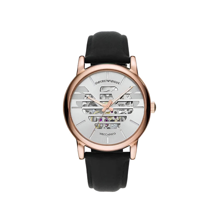 Emporio Armani Meccanico Skeleton Silver Dial Black Leather Strap Watch For Men - AR60031