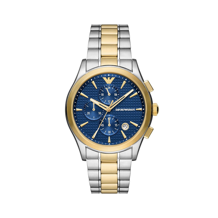 Emporio Armani's 42mm watch features a blue textured cd sunray dial, chronograph movement and two-tone stainless steel bracelet.