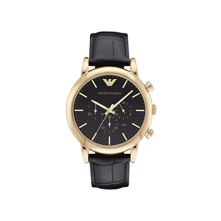 This Emporio Armani Luigi Chronograph Black Dial Men's Watch AR1917 comes in gold-tone stainless steel case with a black leather strap. Fixed gold-tone bezel. Black dial with luminous gold-tone hands and index hour markers. Minute markers around the outer rim. The Emporio Armani logo marks the 12 o'clock position. Dial Type: Analog. Date display between the 4 and 5 o'clock positions.