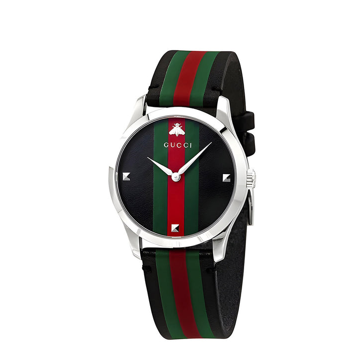 Stainless steel case with a black, red, green striped leather strap. Fixed stainless steel bezel. Black, red, green dial with silver-tone alpha-style hands. Pryamids mark the 3, 6, and 9 o'clock position. Gucci bee logo appears at the 12 o'clock position. Dial Type: Analog. Quartz movement. Scratch resistant sapphire crystal. Pull / push crown. Solid case back. Round case shape. Case size: 38 mm. Case thickness: 8 mm. Band width: 20 mm. Tang clasp. Water resistant at 50 meters / 165 feet. Functions: hour, minute. G-timeless Series. Dress watch style. Watch label: Swiss Made. Gucci G-Timeless Tri-Color Dial Leather Men's Watch YA1264079.