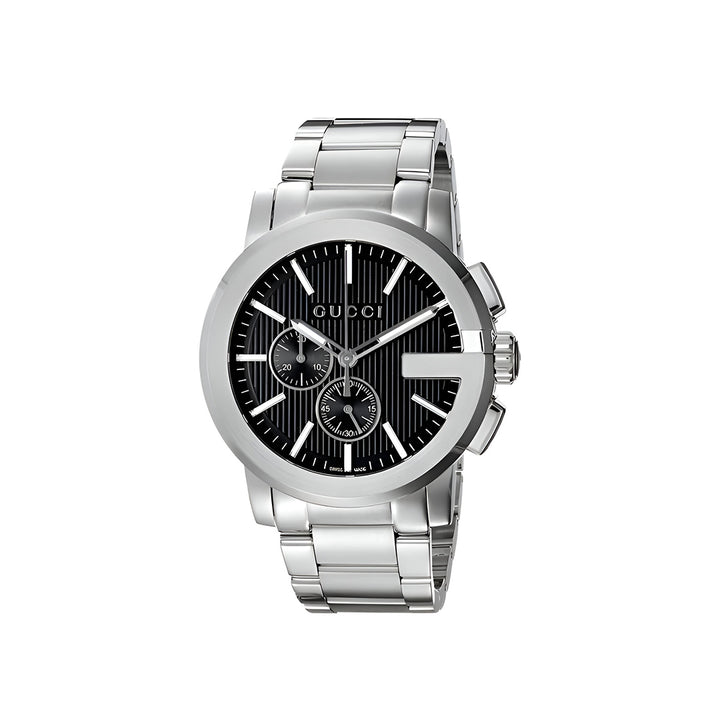 Stainless steel case with a stainless steel bracelet. Fixed G-shaped stainless steel bezel. Black dial with silver-tone hands and index hour markers. Minute markers around the outer rim. Dial Type: Analog. Chronograph - two sub-dials displaying: 60 second and 30 minute. Quartz movement. Scratch resistant sapphire crystal. Solid case back. Case diameter: 44 mm. case thickness: 13 mm. Round case shape. Bracelet width: 23 mm. Deployment clasp. Water resistant at 50 meters / 165 feet. Functions: chronograph, hour, minute, second. Sport watch style. Watch label: Swiss Made. Gucci G-Chrono Black Dial Stainless Steel Mens Watch YA101204.