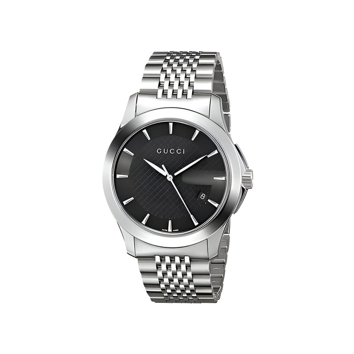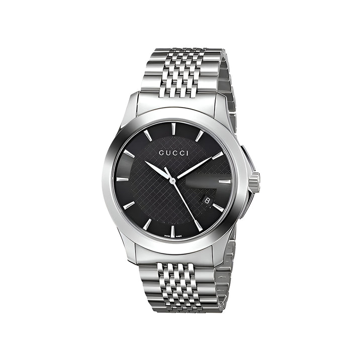 Stainless steel case with a stainless steel link bracelet. Fixed polished stainless steel bezel. Black diamond-pattern dial with luminous silver-tone hands and index hour markers. Dial Type: analog. Date display appears at the 4 o’clock position. Quartz movement. Scratch resistant sapphire crystal. Textured steel crown. Stainless steel case back. Case diameter: 38 mm. Band width: 20 mm. Hidden deployment clasp. Water resistant at 30 meters / 100 feet. Functions: hours, minutes, seconds, calendar. Luxury Sport watch style. Gucci G Timeless Men’s Watch YA126402.