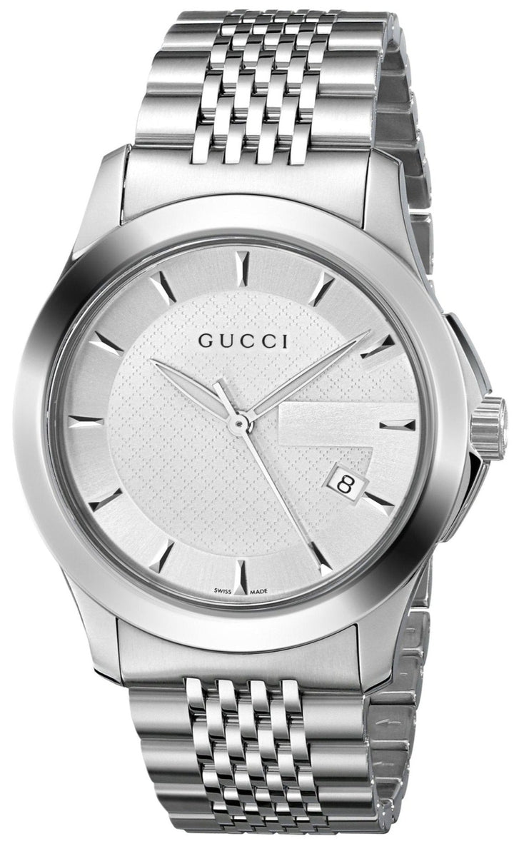 Stainless steel case with a stainless steel bracelet. Fixed stainless steel bezel. Silver dial with silver Gucci 'G' imprint, silver-tone hands and stick hour markers. Date display at the 4 o'clock position. Swiss quartz movement.