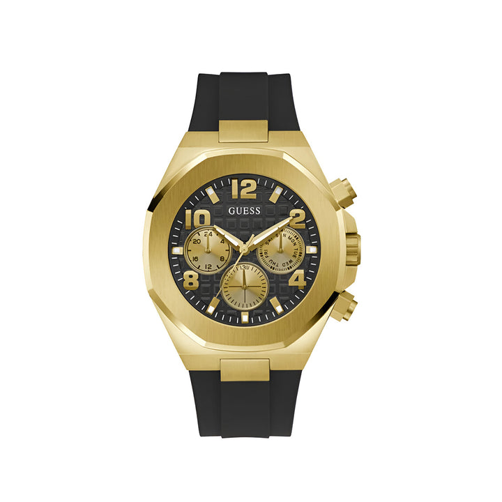 This is the Guess Empire Black Men's Watch GW0583G2. This GUESS watch is designed for those who live a full life. A striking 46mm gold tone case and octagonal bezel pair perfectly with a black and gold multifunction dial and a sporty black silicone strap complete the look. This timepiece is made to work hard alongside you.