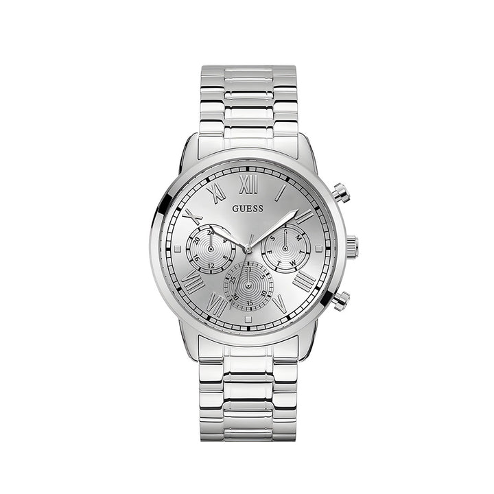 Men's multifunction watch by Guess. The size of the case is 44 mm and is made of polished steel. The quandrante is silver. The bracelet is made of polished steel. Folding clasp. Water resistance is 50 meters