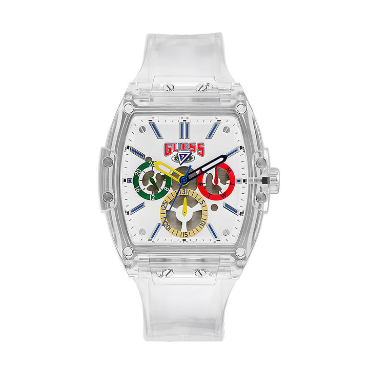 The Guess Phoenix J Balvin watch for men features a sleek white dial and a transparent silicone strap, creating a modern and stylish timepiece. With its reliable accuracy and durable design, this watch is perfect for any occasion. Elevate your style and stay on schedule with Guess Phoenix.