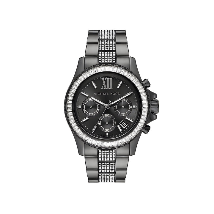 Michael Kors' 42mm Everest watch features a black sunray dial, gunmetal IP case with clear baguette topring, chronograph movement and gunmetal IP bracelet with pavé center links.