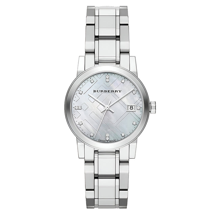 This analogue watch from Burberry has a stainless steel strap in silver, complemented by a mother of pearl dial. Please note, the dial for the Burberry BU9125 ladies' watch has 34 mm in diameter.