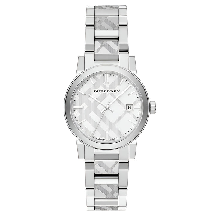 Pull / push crown. Solid case back. Case diameter: 34 mm. Round case shape. Band width: 18 mm. Deployment clasp. Water resistant at 50 meters / 165 feet. Functions: date, hour, minute, second. Casual watch style. Burberry Silver Check Stamped Dial Stainless Steel Ladies Watch BU9144.
