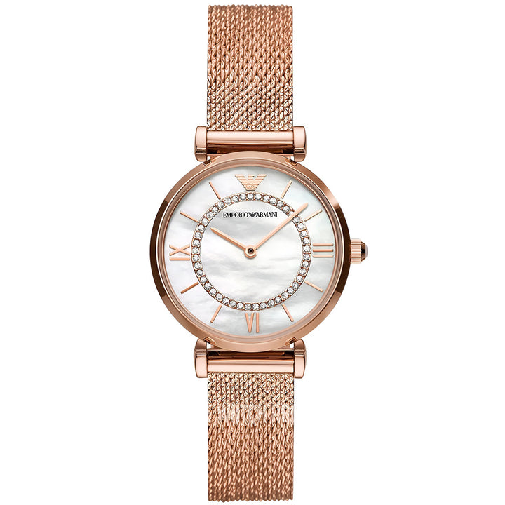 Rose gold-tone stainless steel case with a rose gold-tone stainless steel mesh bracelet. Fixed rose gold-tone bezel. Mother of pearl (crystal-set) dial with rose gold-tone hands and index hour markers. Roman numerals appear at the 3, 6 and 9 o'clock positions. The Emporio Armani Eagle appears at the 12 o'clock position.