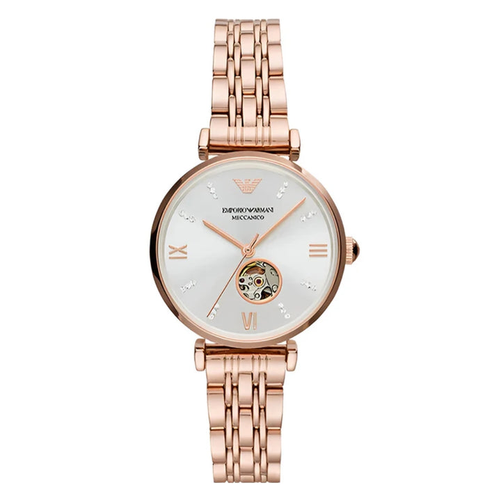 Up the glam factor with Gianni T-Bar's collection from the House of Emporio Armani as it takes it a notch up. This impeccable timepiece fashioned with a glitz-outlined bezel features three-hand movement with a skeleton sub-dial and rose-gold 7-link bracelet to finish the look. This rose-gold automatic watch is surely going to leave you in awe with its design and performance.