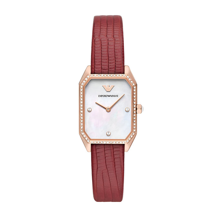 Emporio Armani watch with 24x35mm diameter case with dual hand movement The glossy white mother-of-pearl dial is paired with a red leather strap using LWG certified tanner-sourced leather.