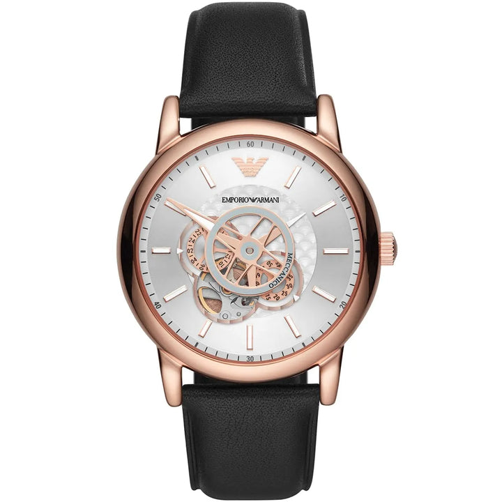 Emporio Armani Meccanico Black Leather Strap Silver Dial Automatic Watch for Mens - AR60013