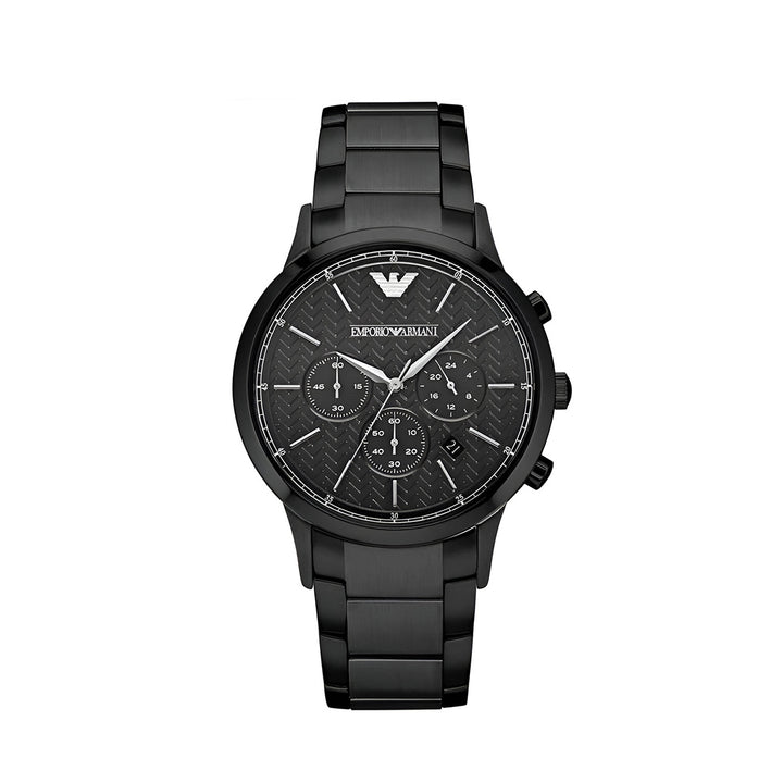 Black ion-plated stainless steel case and bracelet. Fixed black ion-plated bezel. Black (herringbone pattern) dial with silver-tone hands and index hour markers. Minute markers around the outer rim. The Emporio Armani logo appears at the 12 o'clock position. Dial Type: Analog. Date display between the 4 and 5 o'clock positions. Chronograph - three sub-dials displaying: 60 second, 60 minute and 24 hour. Quartz movement. Scratch resistant mineral crystal. Pull / push crown. Solid case back. Round case shape. Case size: 43 mm. Case thickness: 11 mm. Band width: 22 mm. Deployment clasp. Water resistant at 50 meters / 165 feet. Functions: chronograph, date, hour, minute, second. Dress Series. Dress watch style. Emporio Armani Dress Chronograph Quartz Men's Watch AR2485.