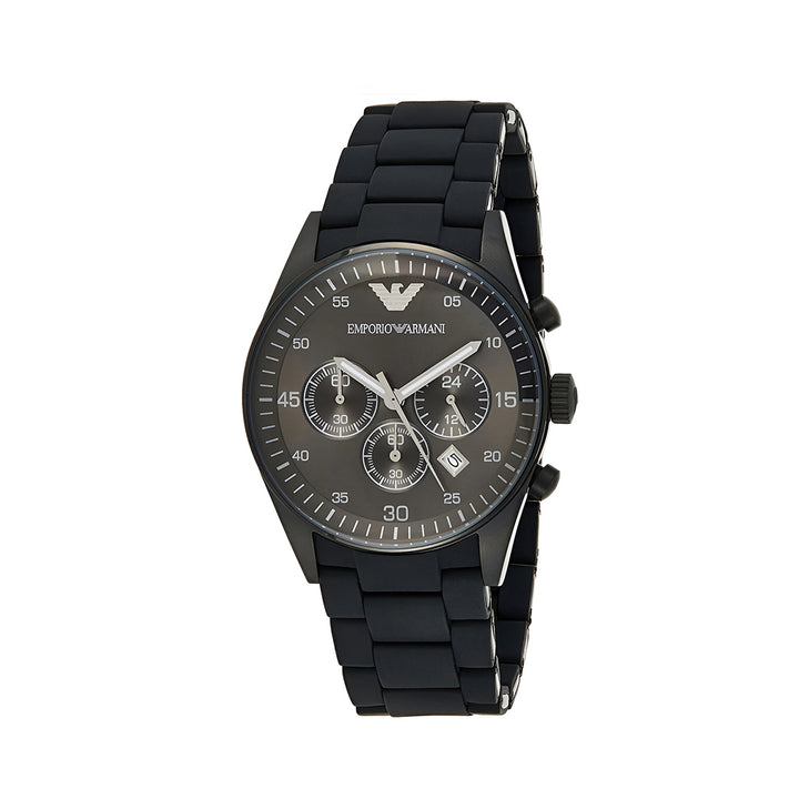 Fashion meets function with this chronograph watch from Emporio Armani. The Grey stainless steel case features a Black dial with three subdials (chronographs) and date window for added functionality. The Black Silicone covered Stainless Steel bracelet adds the finishing touch.