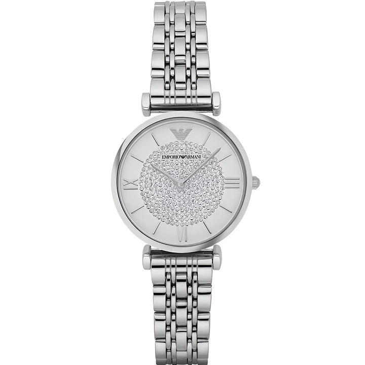 This Ladies Watch has a Stainless steel case with a stainless steel bracelet. Fixed stainless steel bezel. Mother of pearl mosaic dial with silver-tone hands and index hour markers. The Emporio Armani logo appears at the 12 o’clock position. Quartz movement.