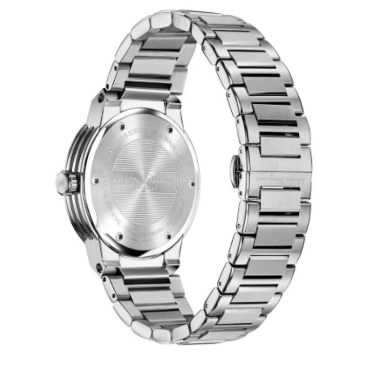 The Ferragamo SFHY02924 Men’s Watch showcases a 44mm stainless steel case with a sleek black dial and matching bracelet. Swiss-made with sapphire crystal and 100m water resistance, it’s a modern luxury watch with timeless versatility.