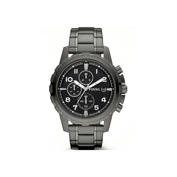 Scratch resistant mineral crystal. Pull / push crown. Solid case back. Case diameter: 45 mm. Case thickness: 11 mm. Round case shape. Band width: 24 mm. Fold over clasp with a safety release. Water resistant at 50 meters / 165 feet. Functions: chronograph, date, hour, minute, second. Casual watch style. Fossil Dean Chronograph Black Dial Smoke Grey Ion-plated Men's Watch FS4721.