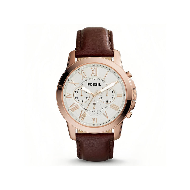 Fossil FS-4991 Chronograph Leather Strap Men’s Watch. The case is made out of rose gold stainless steel with a rose gold bezel, which stands for the high quality of the item, it has a white dial. This model has got 50 meters of water resistance and also has a chronograph in it. it can be worn in scenarios where it is likely to be splashed but not immersed in water and will be fine in rain. The watch is shipped with an original box and a guarantee from the manufacturer.