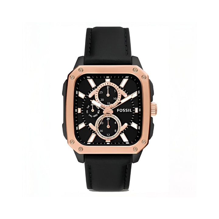 This Fossil watch showcases a sleek black leather strap and multifunctional black dial, perfect for the modern man. Timeless style meets functionality with this versatile timepiece.
