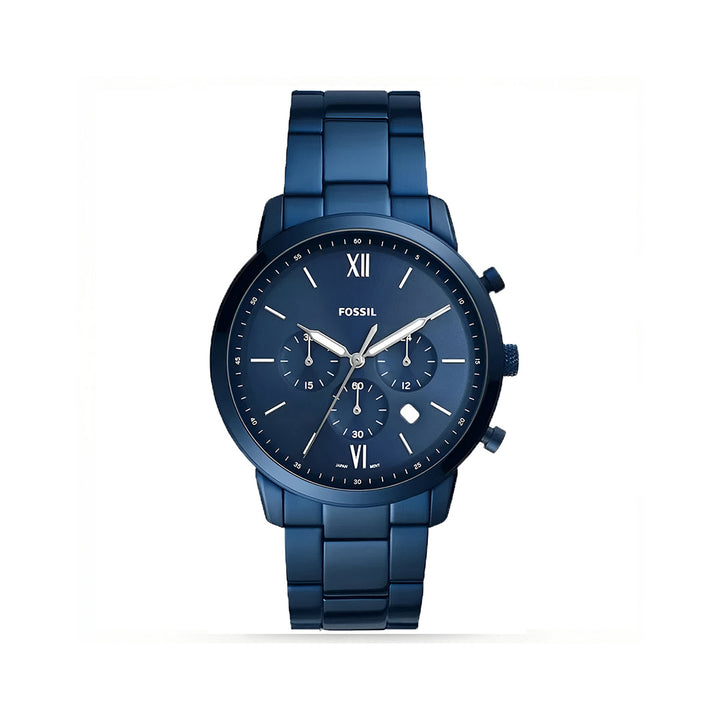 Fossil FS-5826 Neutra Metal Band Men Watch. The case is made out of blue stainless steel with a blue bezel, which stands for the high quality of the item, it has a blue color dial. This model has got 50 meters of water resistance. it can be worn in scenarios where it is likely to be splashed but not immersed in water and will be fine in rain. The watch is shipped with an original box and a guarantee from the manufacturer.