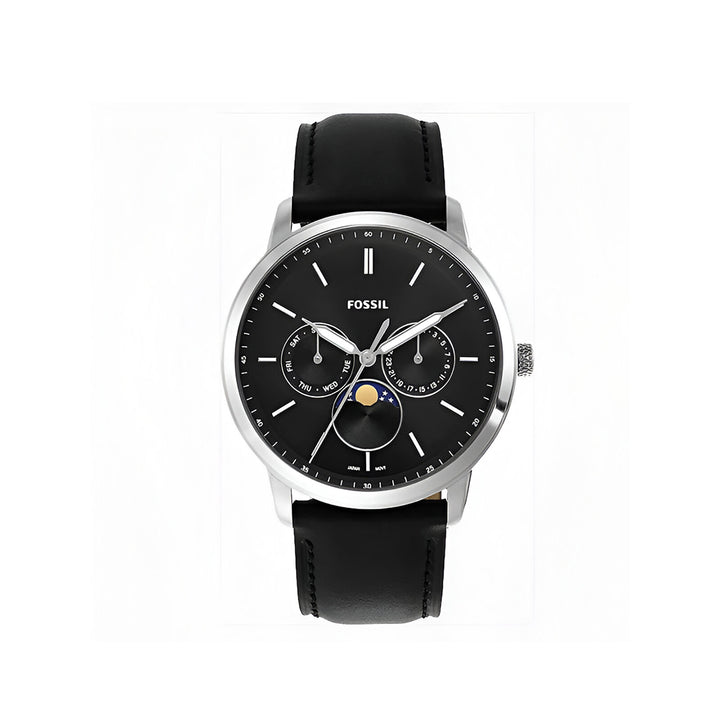 This 42mm Neutra Moonphase features a black sunray dial, moonphase multifunction movement and black LiteHide™ leather strap.The Fossil FS5904 is the quintessential watch for the modern man who values both style and functionality. With its sleek design and versatile features, this timepiece is perfect for any occasion—be it a formal event, a casual day out, or the daily grind at the office. Embrace sophistication and reliability wrapped in a classic aesthetic.
