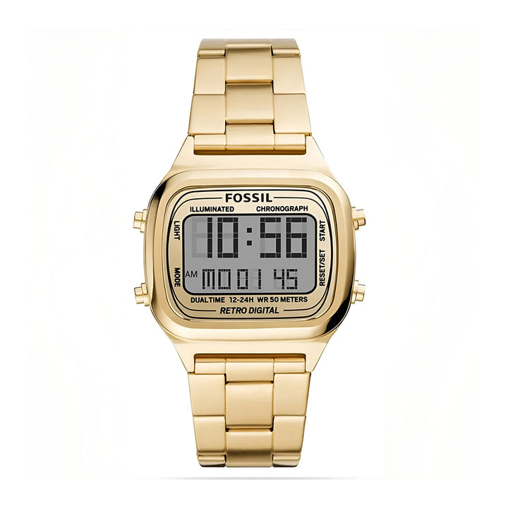 Experience timeless style with the Fossil Retro Digital Men's Watch. Featuring a gold dial and steel strap, this watch offers a touch of luxury to any outfit. With its digital display, you can easily tell time at a glance. Stay on trend and on time with this stylish and functional timepiece.
