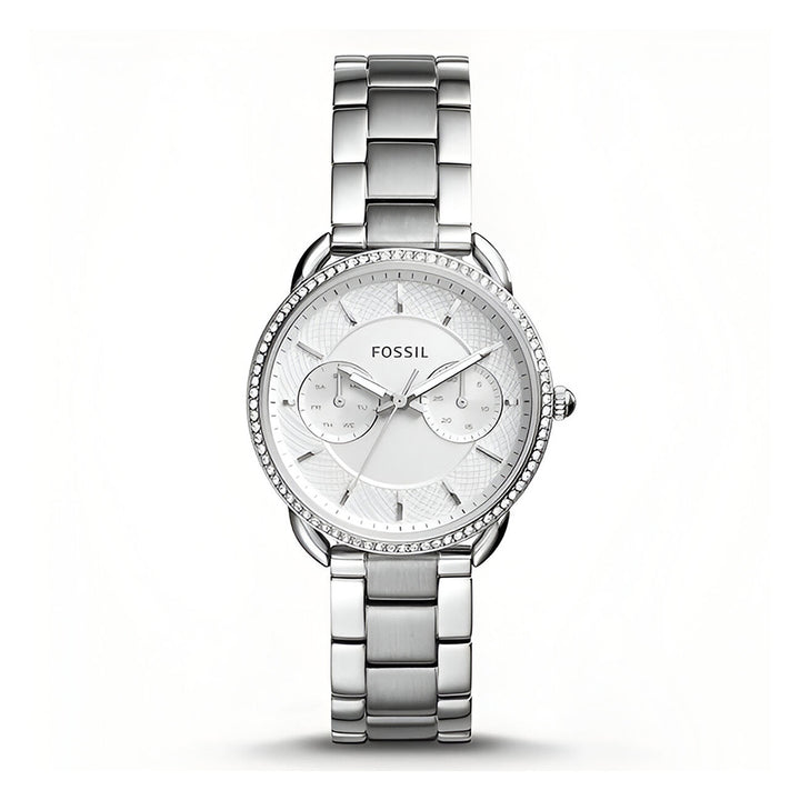 Fossil Women's Multifunction Watch From the Tailor Collection. Model With Round Case In Stainless Steel Silver Color And Glossy Finish. Case Of Diameter Of 35 Mm And Of Thickness Of 10 Mm. The Ring Is Made Of Silver Stainless Steel With Glossy Finish, Silver Dial And Transparent Glass. Watch With Silver Stainless Steel Bracelet With Polished Finish And Deployment Clasp. The Distance Of Anse Is 16 Mm. Model Embellished With Crystals On The Case And Ring. Clock With Quartz Movement And Water