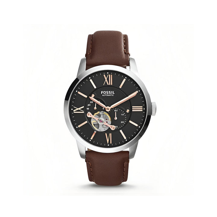 Experience effortless style with the Fossil Townsman Automatic Watch for Men. Featuring a sleek black dial and a luxurious brown leather strap, this watch adds a touch of sophistication to any outfit. With its automatic movement, you'll never have to worry about winding or replacing a battery.