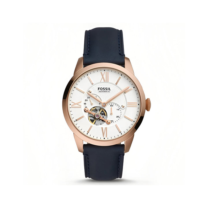 This 44-mm Townsman features a white satin dial with a see-through skeleton sub-eye, automatic movement and a navy leather strap.| BRAND, SELLER, OR COLLECTION NAME | Fossil |