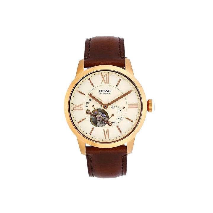 This Fossil Townsman Beige Dial Men's Automatic Watch ME3105 comes in rose gold-tone stainless steel case with a brown leather strap. Fixed rose gold-tone bezel. Beige dial with a skeletal window with rose gold-tone hands and index hour markers. Roman numerals mark the 3, 6, 9 and 12 o'clock positions.