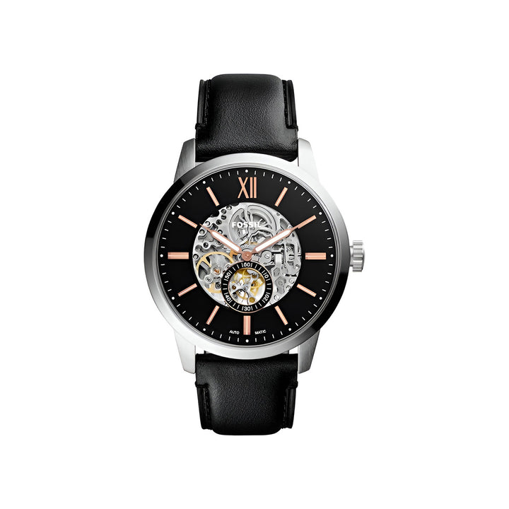 This Fossil Townsman Skeleton Automatic Dial Men's Watch ME3153 comes in stainless steel case with a black leather strap. Fixed stainless steel bezel. Black skeleton dial with luminous rose gold-tone hands and index hour markers. A Roman numeral appears at the 12 o'clock position. Minute markers around the outer rim.