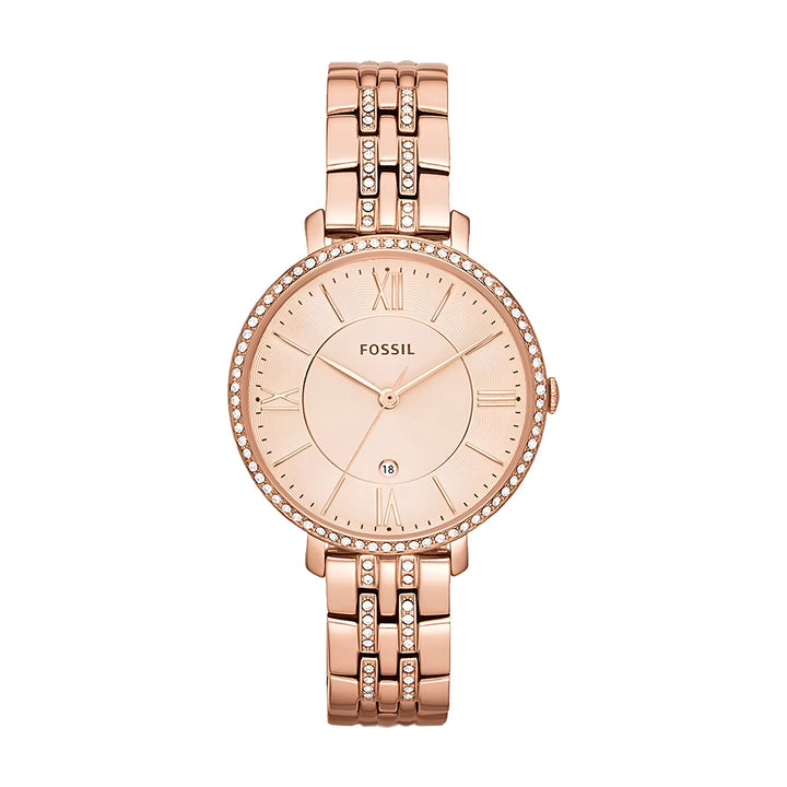 Fossil ES3546 is a Jacqueline rose gold-tone stainless steel ladies' watch.