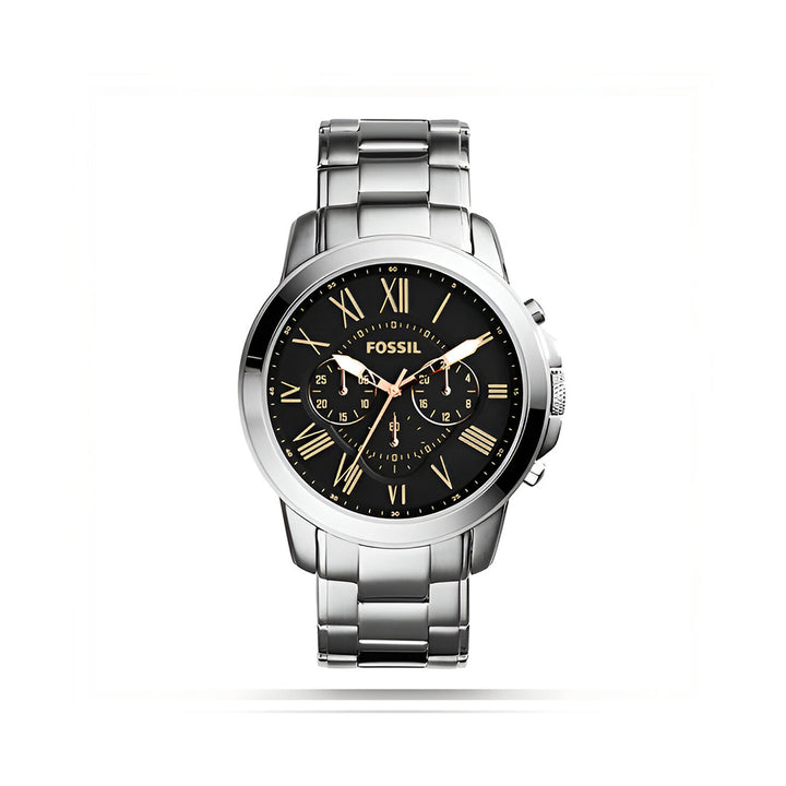 Fossil Grant Chronograph Black Dial Silver Steel Strap Watch for Men - FS4994