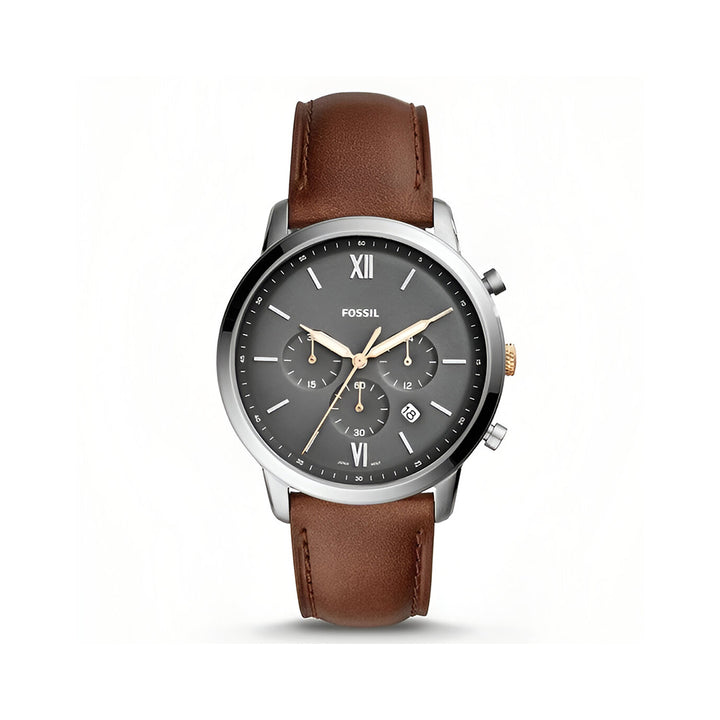This 44mm Fossil Neutra Chronograph Dial Light Brown Leather Men's Watch FS5408 features a gray satin dial with Roman numerals at the 12 and six-hour marker, chronograph movement and supple leather strap.