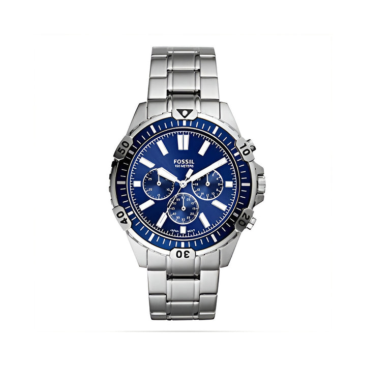 Fossil FS-5623 Metal Band Men Watch. The case is made out of silver stainless steel with a blue bezel, which stands for the high quality of the item, it has a blue color dial. This model has got 100 meters of water resistance. it can be worn in scenarios where it is likely to be splashed but not immersed in water and will be fine in rain. The watch is shipped with an original box and a guarantee from the manufacturer.