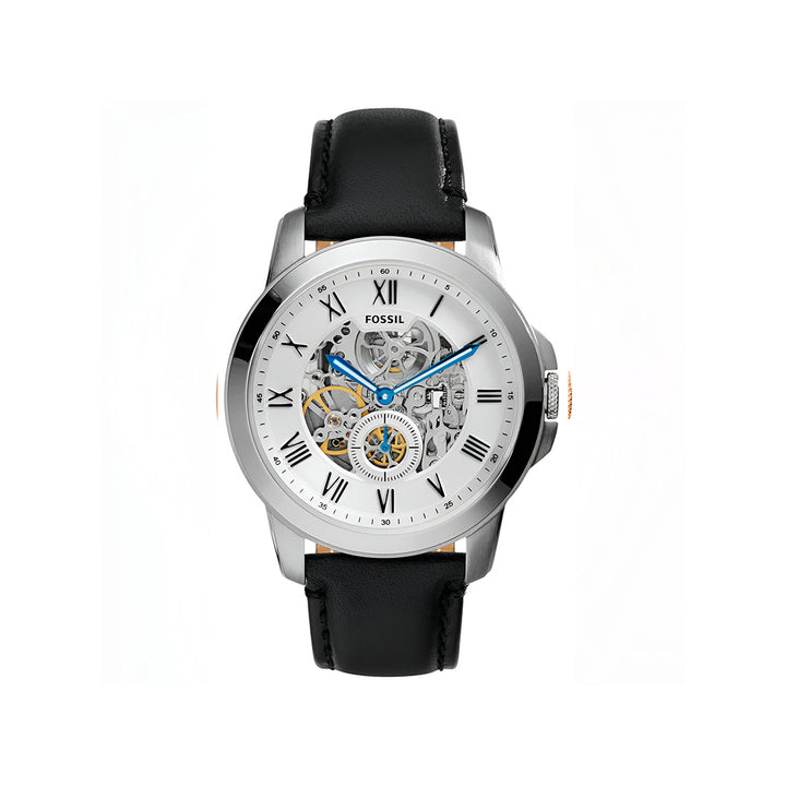Fossil Grant Skeleton White Dial Black Leather Strap Watch for Men - ME3053