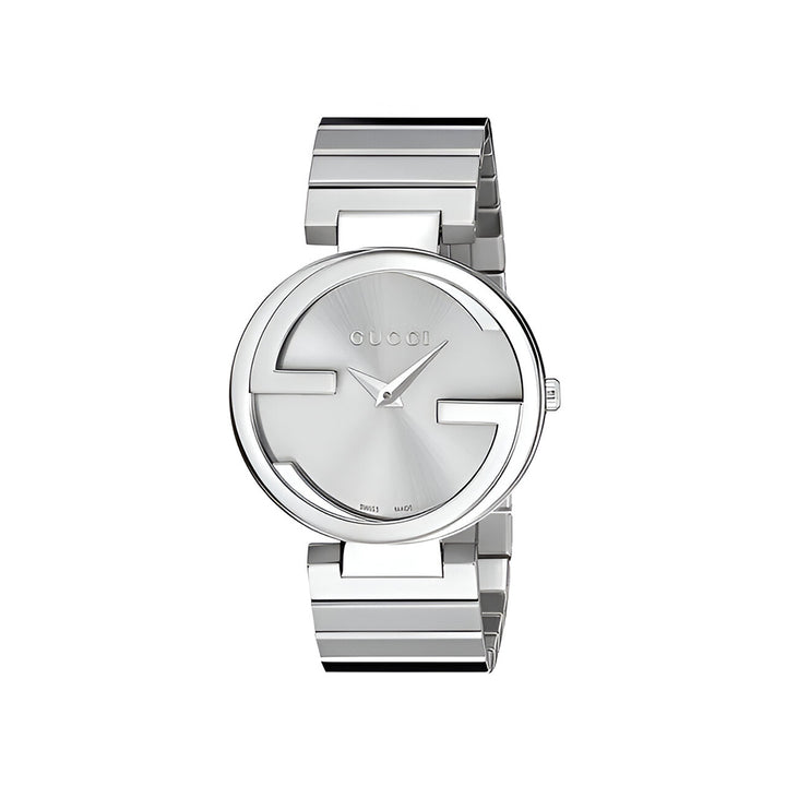 Solid case back. Case diameter: 37 mm. Case thickness: 8 mm. Round case shape. Deployment with push button clasp. Water resistant at 50 meters / 165 feet. Functions: hour, minute. Dress watch style. Watch label: Swiss Made. Gucci Interlocking Silver Dial Stainless Steel Ladies Watch YA133308.