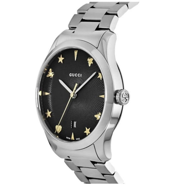 Part of the G-Timeless collection, this classic watch is designed with a traditional sensibility, juxtaposed with codes inspired by Gucci's new aesthetic. House motifs are displayed on the dial, including the bee, the star and the heart. Steel case, black guilloché dial, steel bracelet