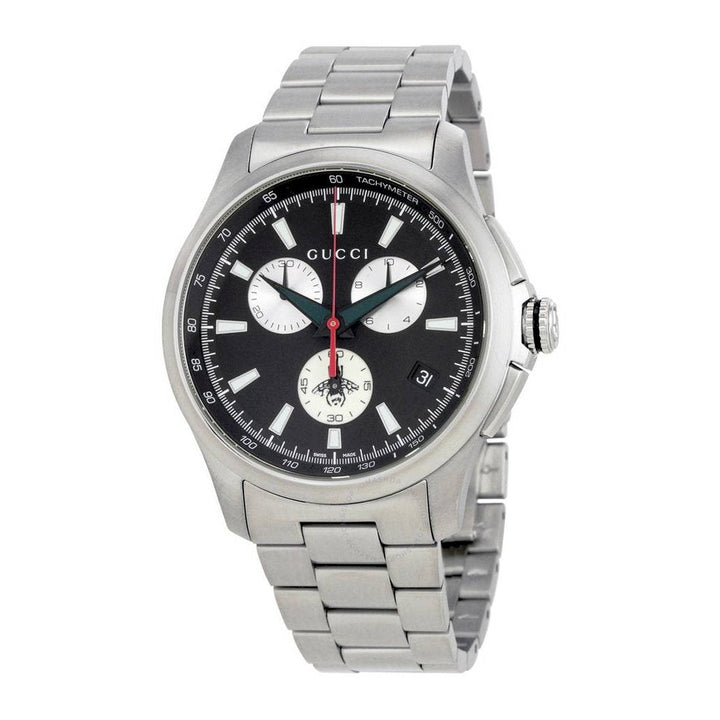 Chronograph - three white sub-dials displaying: 60 second, 30 minute and 1/10th of a second. Quartz movement. Scratch resistant sapphire crystal. Solid case back. Case size: 44 mm. Case thickness: 11 mm. Round case shape. Bracelet width: 22 mm. Deployment clasp with a push button release. Water resistant at 50 meters / 165 feet. Functions: chronograph, tachymeter, date, hour, minute, second. Dress watch style. Watch label: Swiss Made. Gucci G-Timeless Chronograph Black Dial Men's Watch YA126267.
