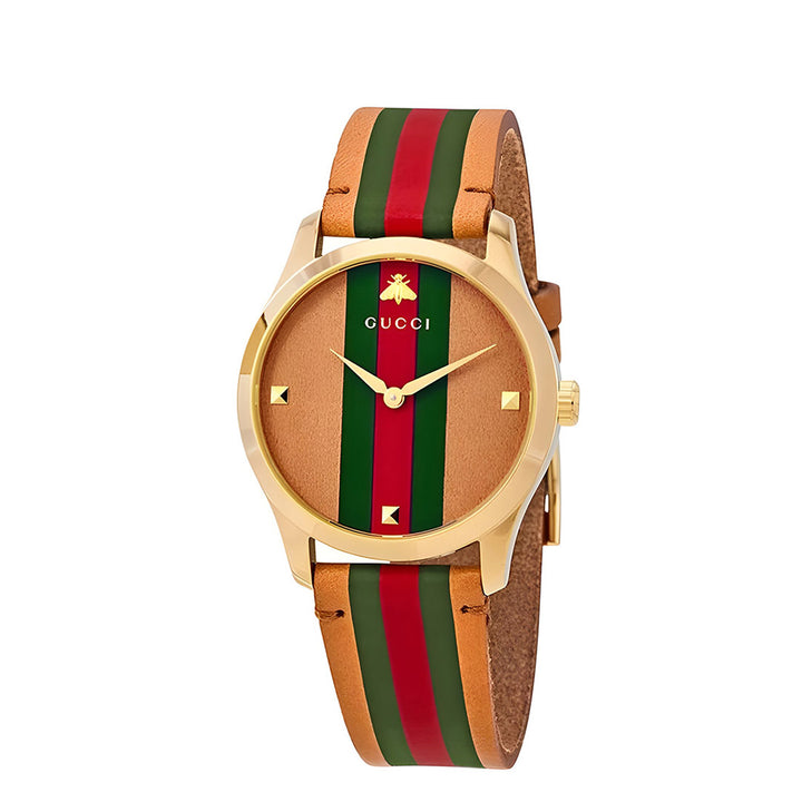 Gucci G-Timeless Gold Stainless Steel Quartz Brown (Stripe Motif) Dial Brown Leather (Stiped) Band Watch