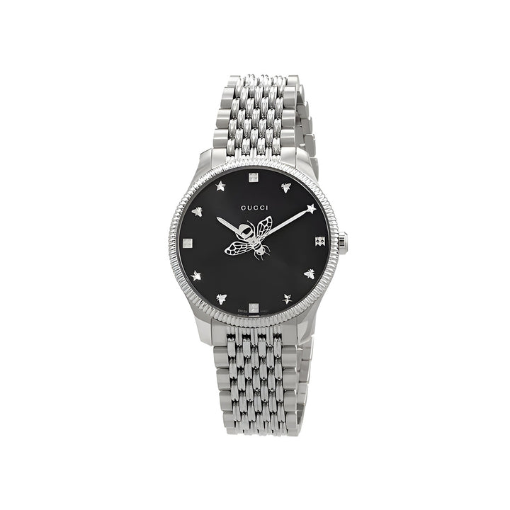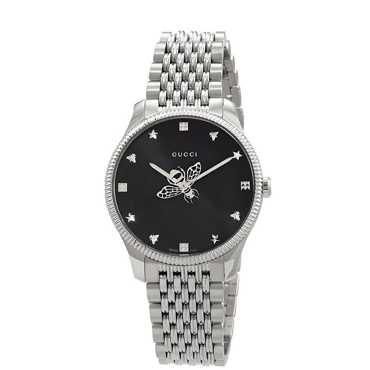 Stainless steel case with a stainless steel bracelet. Fixed stainless steel bezel. Black (slim bee) dial with silver-tone hands and index hour markers. Dial Type: Analog. Quartz movement. Scratch resistant sapphire crystal. Pull / push crown. Solid case back. Round case shape. Case size: 36 mm. Case thickness: 8 mm. Band width: 14 mm. Deployment clasp with a push button release. Water resistant at 50 meters / 165 feet. Functions: hour, minute. G-timeless Series. Dress watch style. Watch label: Swiss Made. Gucci G-Timeless Quartz Black Dial Unisex Watch YA1264154
