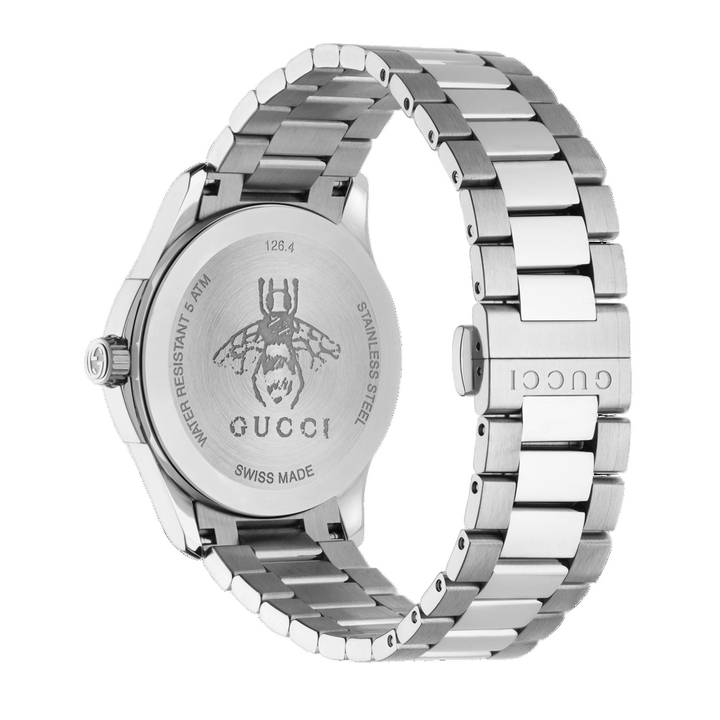 Solid case back. Round case shape. Case size: 38 mm. Case thickness: 8 mm. Band width: 20 mm. Fold over clasp with a push button release. Water resistant at 50 meters / 165 feet. Functions: hour, minute, second. Casual watch style. Watch label: Swiss Made. Gucci G-Timeless