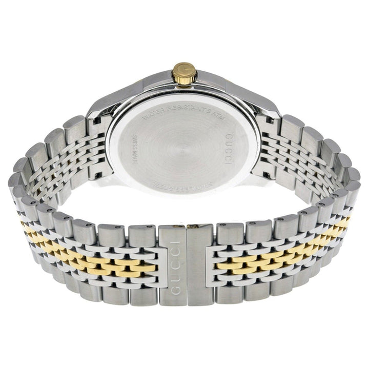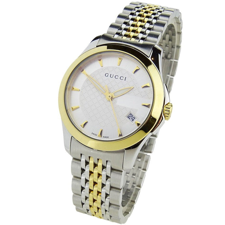 Stainless steel case with a two-tone (silver and gold PVD) stainless steel bracelet. Fixed gold PVD bezel. Silver dial with luminous gold-tone hands and index hour markers. The Gucci name appears below the 12 o'clock position. Dial Type: analog. Date display appears at the 4 o'clock position. Quartz movement. Scratch resistant sapphire crystal. Solid case back. Case diameter: 27 mm. Hidden folding clasp. Water resistant at 30 meters/ 100 feet. Functions: hours, minutes, seconds, calendar. Dress watch style. Gucci Swiss G-Timeless Stainless Steel Bracelet Ladies Watch YA126511.