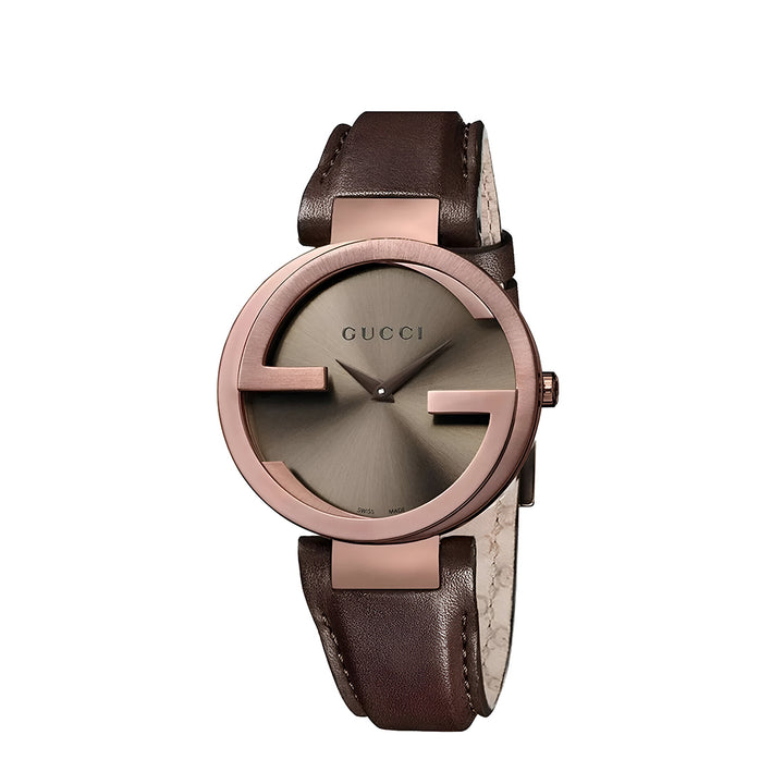 Brown PVD stainless steel case with a brown (calfskin) leather strap. Fixed (interlocking G) brown PVD bezel. Brown dial with chocolate hands. No markers. The Gucci name appears at the 12 o’clock position. Dial Type: Analog. Quartz movement. Scratch resistant sapphire crystal. Pull / push crown.