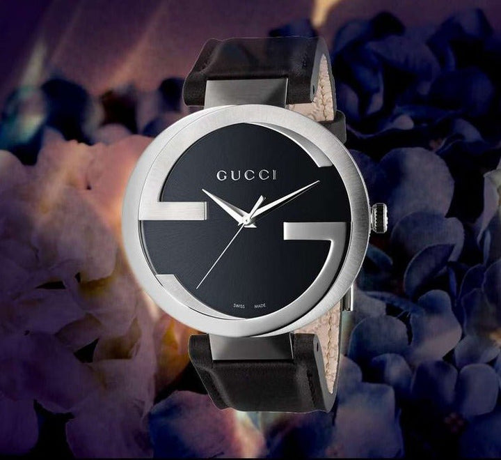 Stainless steel case with a black (calfskin) leather strap. Fixed interlocking G stainless steel bezel. Black dial with silver-tone hands. No markers. The Gucci name appears above center dial. Dial Type: Analog. Quartz movement. Scratch resistant sapphire crystal. Pull / push crown. Solid case back. Case diameter: 42 mm.