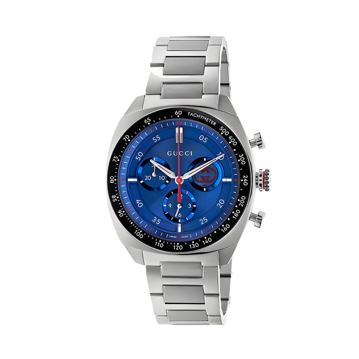 Silver-tone stainless steel case and bracelet. Fixed tachymeter scale black ceramic bezel. Blue dial with silver-tone hands and index hour markers. Minute markers around the outer rim. Dial Type: Analog. Luminescent hands and markers. Chronograph - three sub-dials displaying: 60 second, 30 minute and 12 hour. Quartz movement. Scratch resistant sapphire crystal. Solid case back. Round case shape, case size: 41 mm. Fold over clasp with a safety release. Water resistant at 100 meters / 330 feet. Functions: chronograph, date, hour, minute, second. Interlocking G Series. Sport watch style. Watch label: Swiss Made. Gucci Interlocking G Chronograph Quartz Blue Dial Men's Watch YA142317.