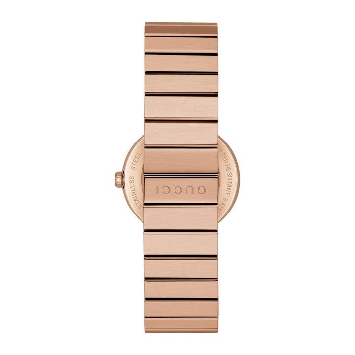 Rose gold-tone stainless steel case and bracelet. Fixed interlocking G rose gold-tone bezel. Mother of pearl dial with rose gold-tone hands. No markers. Dial Type: Analog. Quartz movement.